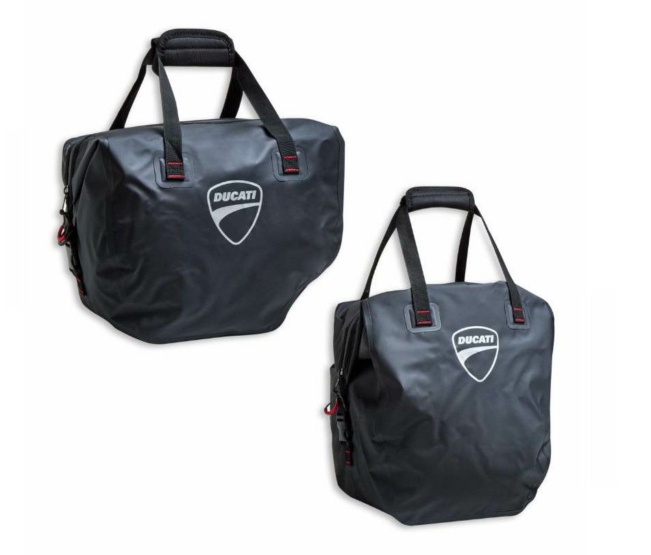 Accesorio muy útil creado para aprovechar al máximo todo el espacio disponible y mantener el orden dentro de las maletas. Las cómodas bolsas, realizadas de tejido negro resistente waterproof y personalizadas con el logotipo Ducati Performance, se pueden llenar en casa o en el hotel, sin tener que desmontar las maletas laterales de la moto. Además, las prácticas asas permiten transportarlas como maleta de mano, permitiendo que sean un producto versátil, para maximizar el confort y funcionalidad en cada viaje, sin renunciar al estilo.