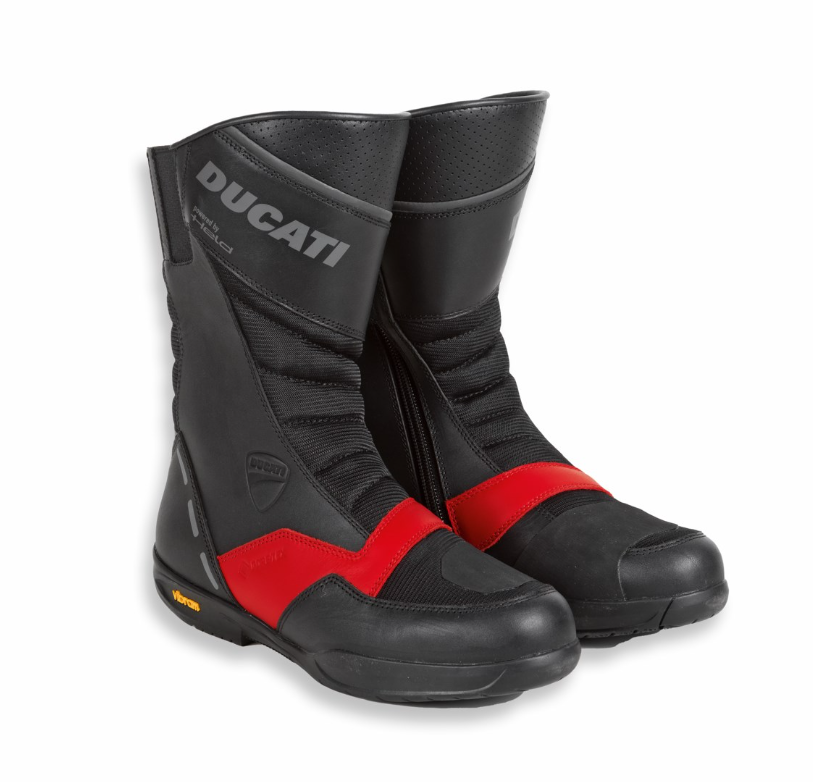 Ideales para el turismo, incorporan soluciones de alta gama como una membrana Gore-Tex® impermeable y transpirable y una suela de goma Vibram® antideslizante, lo que las hace perfectas incluso para recorrer distancias medias sin moto. La parte superior está fabricada en cuero y tejido técnico, mientras que el suave forro de poliéster proporciona un ajuste excepcionalmente cómodo. Los refuerzos en la puntera y el talón, así como la protección del tobillo, ofrecen el nivel adecuado de seguridad durante la conducción. Un refuerzo para la palanca de cambios y una cremallera lateral con cierre de Velcro® las hacen especialmente prácticas y versátiles, mientras que las inserciones reflectantes mejoran la visibilidad. Un accesorio dedicado a los motociclistas que buscan un rendimiento excelente combinado con el inconfundible estilo Ducati.