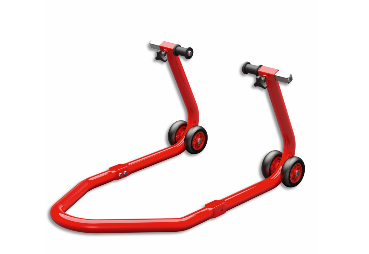 Equipado con ruedas de goma montadas sobre rodamientos y con un excelente acabado, está diseñado para levantar y estacionar la motocicleta, garantizando facilidad de uso y fiabilidad tanto en la pista como en el taller.