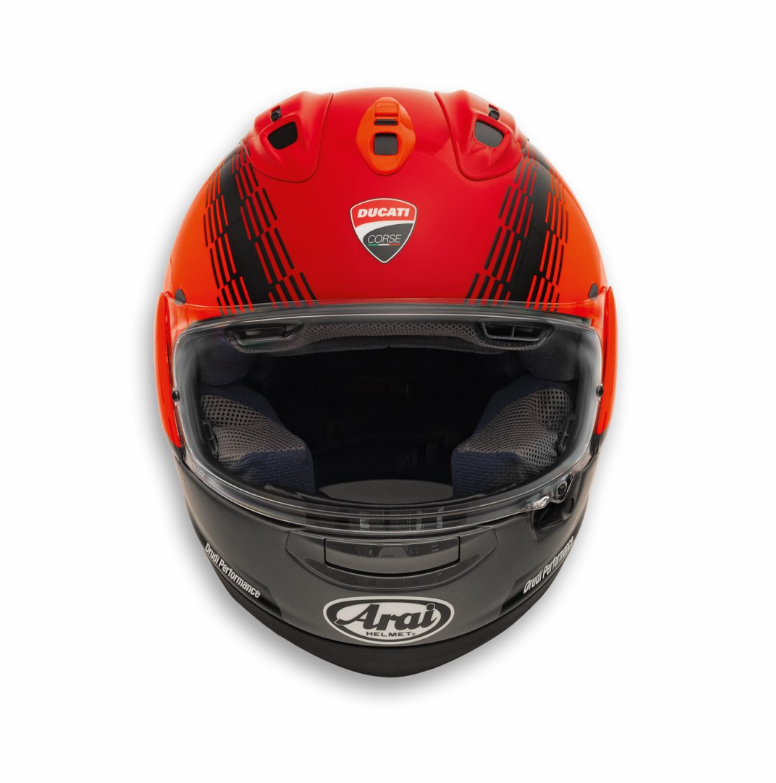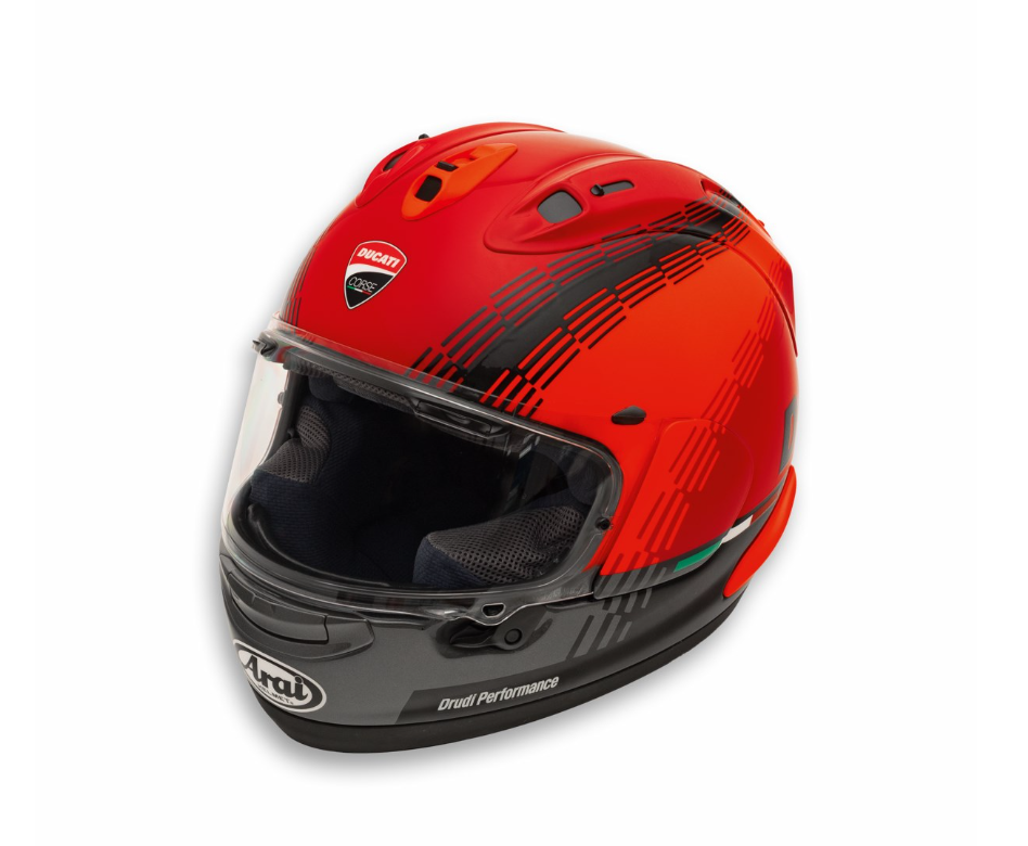 Diseñado específicamente por Arai para la conducción deportiva, este casco representa la excelencia en estilo, comodidad y seguridad. Audaz e icónico, cautiva con su diseño de Drudi Performance, inspirado en la decoración de MotoGP, donde el toque estilístico de la curva roja fluorescente destaca sobre el fondo rojo Ducati. La calota exterior, fabricada en PB-SNC2 (Structural Net Composite), añade rigidez a la resina, protegiendo contra impactos y disipando la energía en caso de colisión. La seguridad del piloto se ve reforzada por el sistema Peripherally Belted SNC, una banda de refuerzo protectora que rodea la parte superior de la calota. La visera más ancha aumenta la visibilidad en las curvas, mientras que las propiedades antiarañazos y antivaho, combinadas con el soporte interno V-Shield (más grande que la versión anterior), proporcionan al piloto comodidad y seguridad gracias a la tecnología VAS, que garantiza una visión periférica perfecta. El difusor aerodinámicamente optimizado, el extractor lateral y la entrada de aire superior con mayor eficiencia de flujo de aire son los pilares del avanzado sistema de ventilación. Este sistema también incluye un canal capaz de crear un efecto de succión desde la abertura ocular hasta el conducto lateral, y un nuevo cierre deslizante que reduce el ruido a la vez que aumenta la durabilidad y la impermeabilidad del casco. El soporte de espuma elástica FCS se ha extendido hasta el pómulo para un ajuste más cómodo y una excelente estabilidad a altas velocidades. El interior, fabricado con tejido Eco-Pure® hipoalergénico de alta calidad, y el sello de cuello ventilado son totalmente extraíbles y lavables. Un casco dedicado a los Ducatistas más exigentes, que buscan el máximo rendimiento sin sacrificar el innegable estilo racing que caracteriza a toda la colección Ducati Corse.