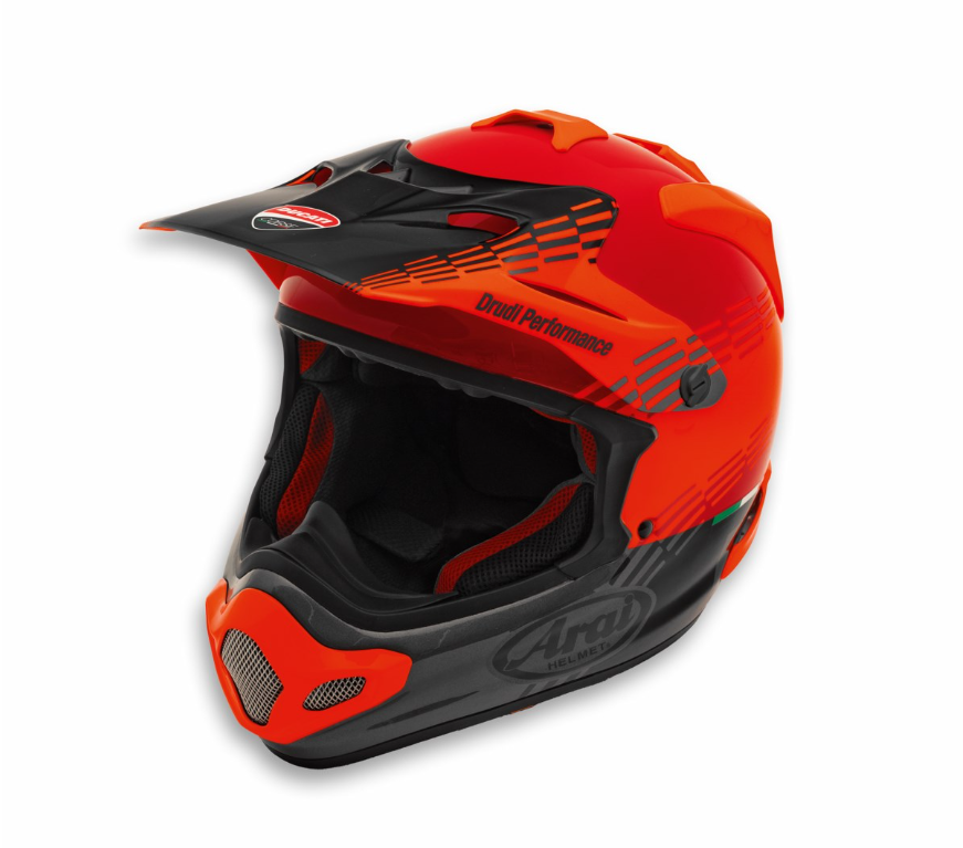 La calota exterior está fabricada en ScLc (Super Complex Laminate Construction), un material un 40 % más resistente que la fibra de vidrio estándar. El forro interior extraíble de tejido Eco-Pure® y el Sistema de Contorno Facial (FCS) con soporte elástico que se extiende hasta el pómulo hacen que el casco sea más cómodo y fácil de usar, a la vez que garantizan una excelente estabilidad con una presión mínima. La ventilación es una característica clave de este casco, gracias a la visera aerodinámicamente optimizada, los difusores que crean un efecto Venturi en la parte trasera y las múltiples entradas de aire que mejoran el flujo de aire en el interior. La visera solar alargada y redondeada de Arai, diseñada para proteger contra el barro y otros residuos, cuenta con ventilaciones frontales de refrigeración y múltiples puertos de escape para reducir la sustentación a altas velocidades. La excelente protección contra la suciedad se maximiza gracias a la toma de aire bucal externa, que mejora la resistencia a la penetración, y a la máscara de malla de acero inoxidable de una sola pieza, que proporciona una barrera adicional contra salpicaduras y reduce la acumulación de barro. El alto nivel de seguridad y comodidad también se refleja en la estética, gracias al diseño Drudi Performance, que evoca las decoraciones de competición de los "Rojos" de Borgo Panigale en varios campeonatos. La llamativa pintura brillante se complementa con la distintiva curva roja fluorescente sobre una base roja Ducati, creando un estilo que unifica todas las prendas de la nueva colección cápsula dedicada al mundo del motocross.