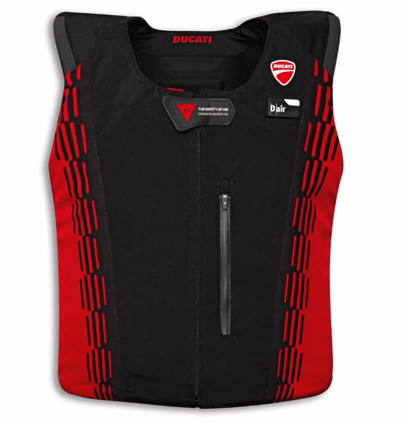 El chaleco de tela con airbag Ducati Smart Air integrado, desarrollado en colaboración con el socio de larga data Dainese, se centra en la seguridad al tiempo que lleva la comodidad y la versatilidad a un nuevo nivel. Ligero, aireado y compacto, se puede usar encima o debajo de cualquier prenda exterior y se pliega fácilmente cuando no se usa. El sistema no requiere ninguna conexión a la moto y dispone de una batería recargable que permite circular hasta 12 horas garantizando la máxima libertad de uso.