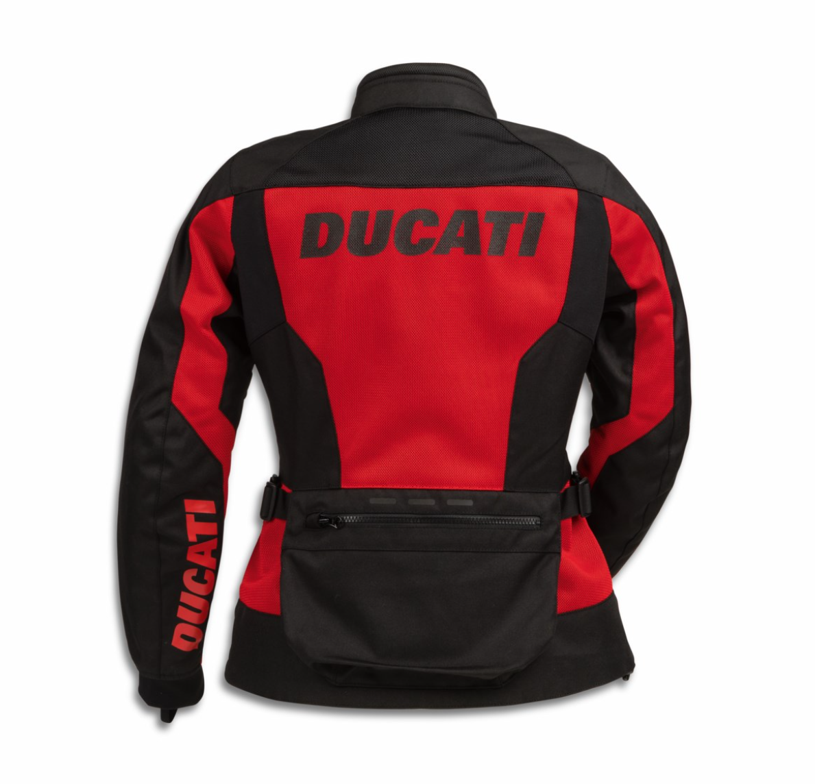 La chaqueta de tejido Tour Summer C1, desarrollada por Spidi en exclusiva para Ducati, es una prenda transpirable, versátil y completamente certificada. Confeccionada de red de poliéster con aplicaciones de tejido elástico Tenax resistente a la abrasión, ofrece la máxima ventilación gracias a las amplias zonas de red que favorecen un generoso paso del aire. La chaqueta está dotada de membrana desmontable H2Out®, impermeable, antiviento y transpirable, confeccionada de tejido laminado de 2 capas para llevar encima o debajo de la chaqueta principal, como impermeable o antiviento, o también sola. El interior incluye las protecciones Warrior Lite en los hombros y codos y está predispuesto para la inserción del protector de espalda (se vende por separado). Una prenda que ofrece el máximo confort y practicidad, gracias a la cremallera que permite combinar la chaqueta a los pantalones homónimos, a los cómodos puños de neopreno, y al bolsillo grande en la espalda para guardar la membrana cuando no se utiliza. Completa la dotación el cómodo bolsillo impermeable interno, para mantener los documentos y los efectos personales siempre secos. Las impresiones reflex aumentan la visibilidad y añaden un toque de estilo al inconfundible rojo que caracteriza el diseño de la prenda. Disponible tanto en versión para mujer como para hombre, es la chaqueta dedicada a los Ducatistas que, solos o en pareja, aman las salidas aventureras en pleno verano o para descubrir destinos exóticos.