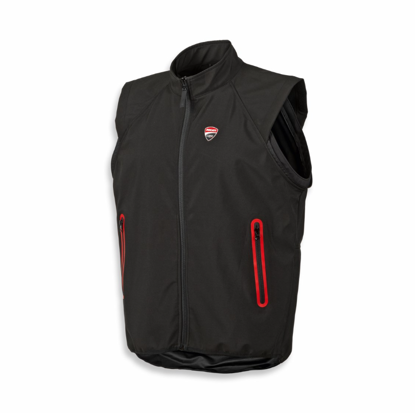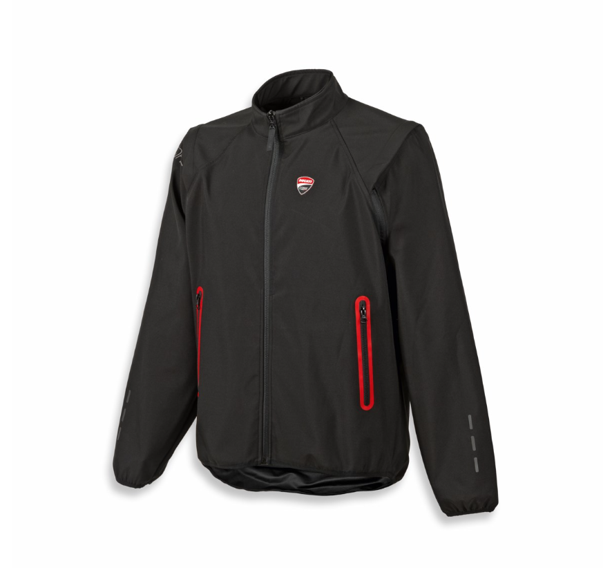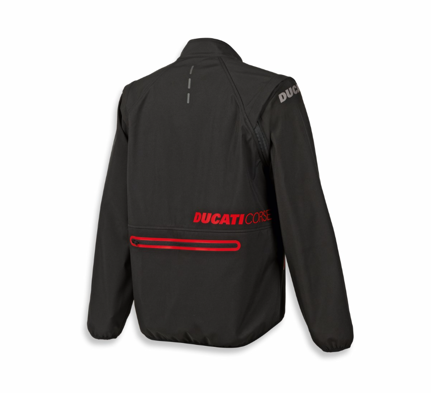 Fabricada en softshell elástico, se compone de una combinación de 3 capas: tejido softshell, membrana cortavientos y transpirable, y microfibra. Los estampados reflectantes aumentan la visibilidad nocturna, mientras que las mangas extraíbles, que se pueden plegar en el amplio y práctico bolsillo trasero, permiten adaptarse a diferentes condiciones climáticas. Finalmente, el elástico en el bajo y los puños garantiza un ajuste excelente. Su discreto diseño, realzado por los icónicos detalles en rojo Ducati, la convierte en la prenda perfecta para quienes buscan una chaqueta técnica para usar tanto en moto como fuera de ella.