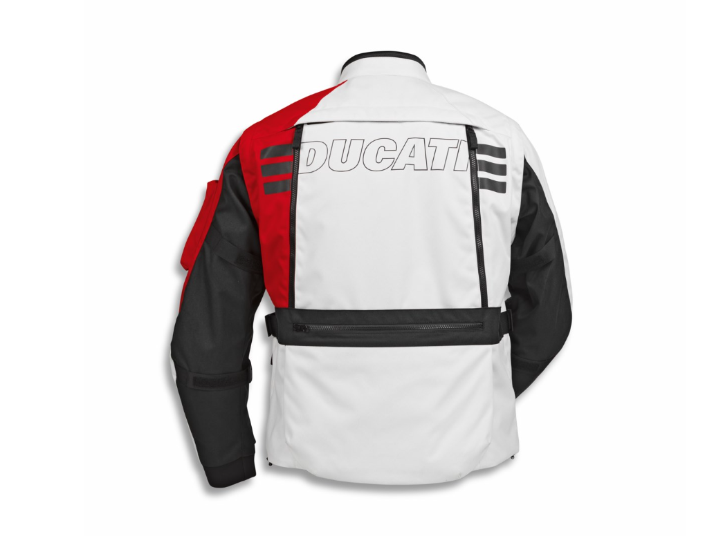 Diseñada por Drudi Performance y producida por Spidi en exclusiva para Ducati, la chaqueta Ducati Explorer es una prenda estudiada para recorridos largos, para llevar con el pantalón homónimo, para crear un conjunto de estética rally y características de touring-enduro. La prenda, disponible también en versión para mujer, es sumamente cómoda, duradera y ajustable y propone dos chaquetas en una, para ofrecer un óptimo confort en diferentes condiciones meteorológicas y térmicas. La capa de protección, de tejido Cordura de elevada dureza y resistente a la abrasión y con tratamiento repelente al agua, se combina con una membrana extraíble H2Out®, impermeable, antiviento y transpirable, de tejido laminado de 3 capas, para llevar tanto encima como debajo de la chaqueta principal. Las ventilaciones regulables en los brazos y pecho, el gran extractor de aire en la espalda y las tomas de aire de mayores dimensiones garantizan una elevada ventilación si la temperatura lo exige, maximizando la practicidad. Otros detalles de confort son la regulación con dobladillo del bajo de la chaqueta, las bolsillos múltiples y amplios, los puños de neopreno. La versión para hombre de la chaqueta Ducati Explorer está disponible en dos variantes de color, rojo/blanco/negro y negro/rojo. Además, presenta un diseño asimétrico distintivo de bloques de color que combina perfectamente con las ilustraciones gráficas de DesertX Rally y Multistrada. La prenda ideal para subirse a la moto y liberar los propios deseos de aventura, transformando cada viaje en emoción pura.