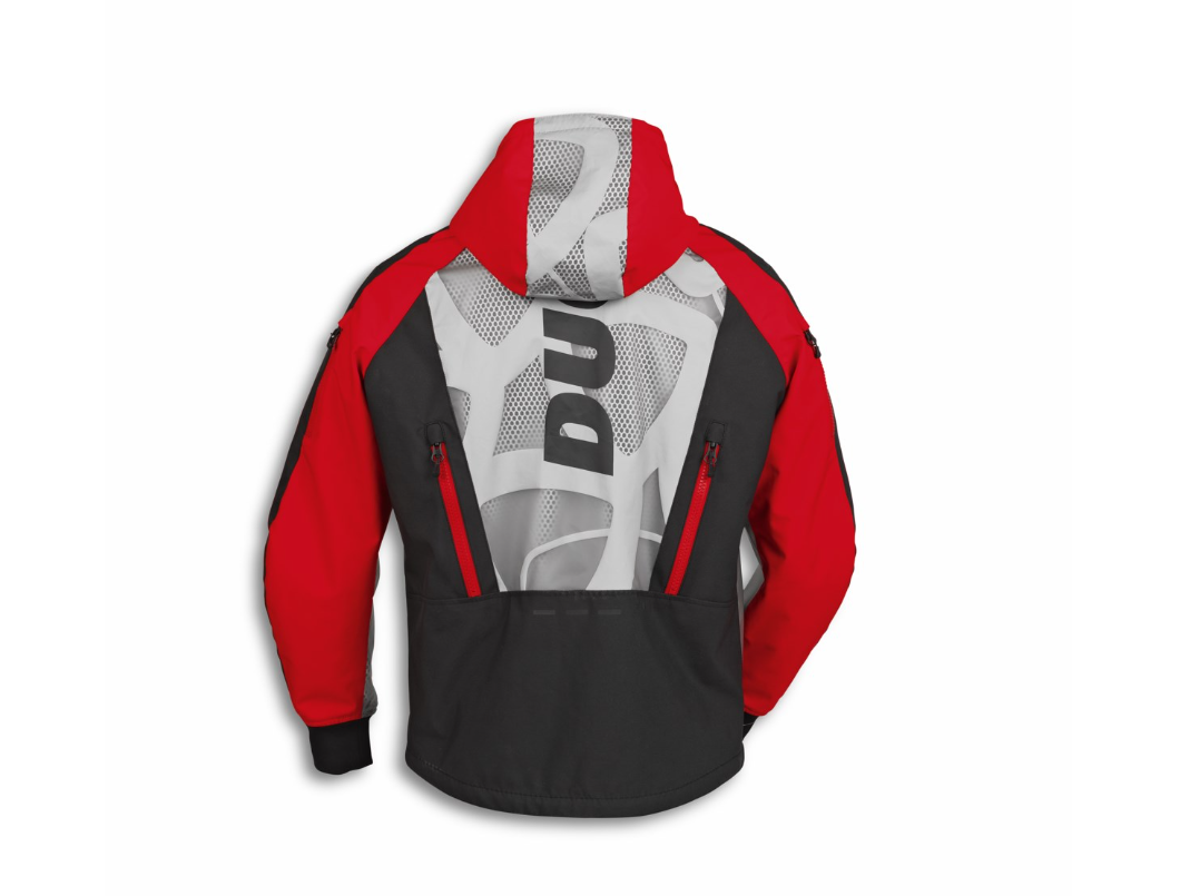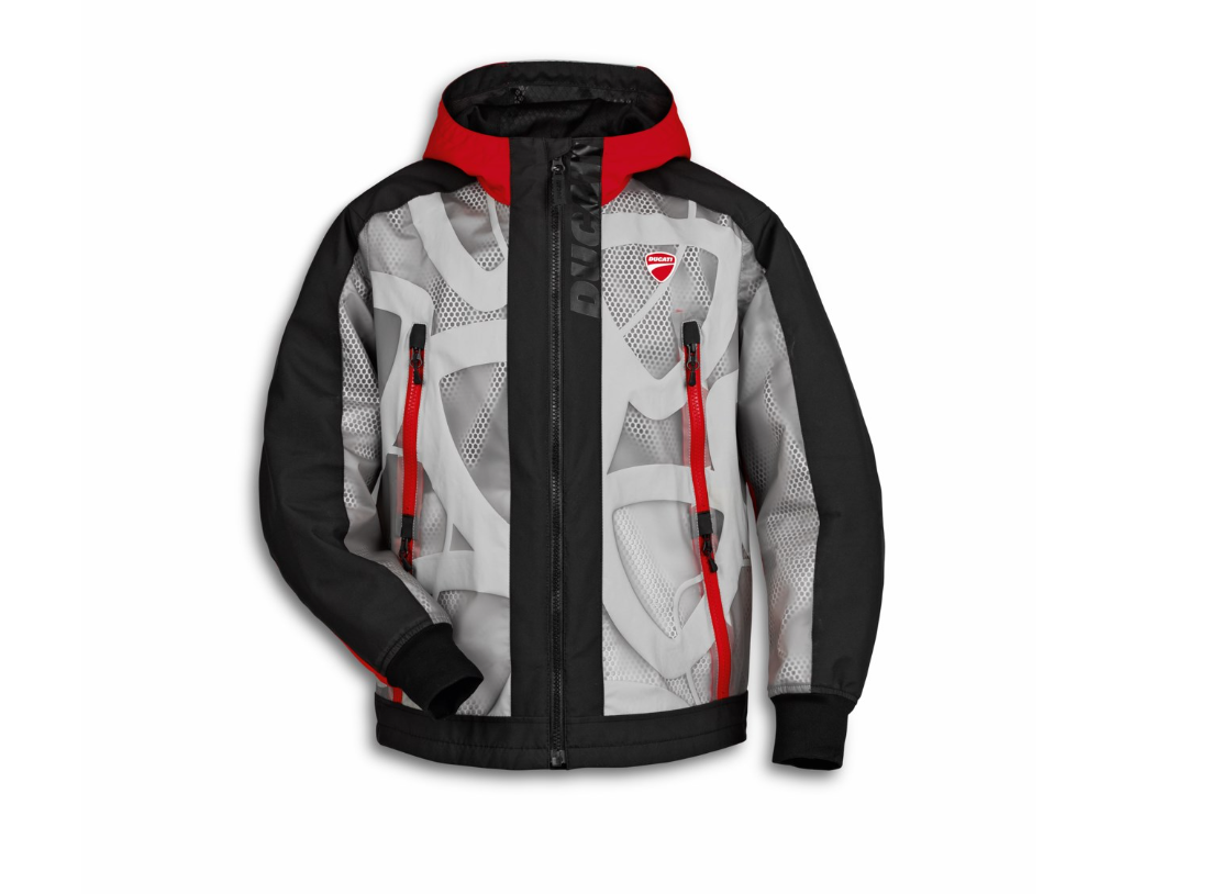 El inconfundible diseño de Drudi Performance se suma a las prestaciones Spidi en un proyecto especial desarrollado en exclusiva para Ducati y da vida a la moderna chaqueta de tejido Ducati Overlay YO, una prenda repelente al agua y antiviento que hace del estilo y la modularidad sus virtudes. El exterior es de poliuretano transparente y poliéster de dos capas, mientras que el forro es de red 3D presenta el 80% de superficie perforada para mejorar la transpiración. Las amplias tomas de aire presentes en el cuerpo y debajo de las mangas incrementan aún más el confort térmico. Para llevar también sola como chaqueta para el tiempo libre, se puede combinar fácilmente con la camiseta con protecciones Overlay P01 para usar en la conducción de la moto. Además, se puede combinar con la sudadera térmica Overlay L01 gracias a la cremallera central de unión y los alamares en la parte de atrás del cuello y en los puños. Disponible solo en versión para hombre, es una chaqueta exclusiva de estética cuidada, que no decepciona en cuanto a las prestaciones y el confort.