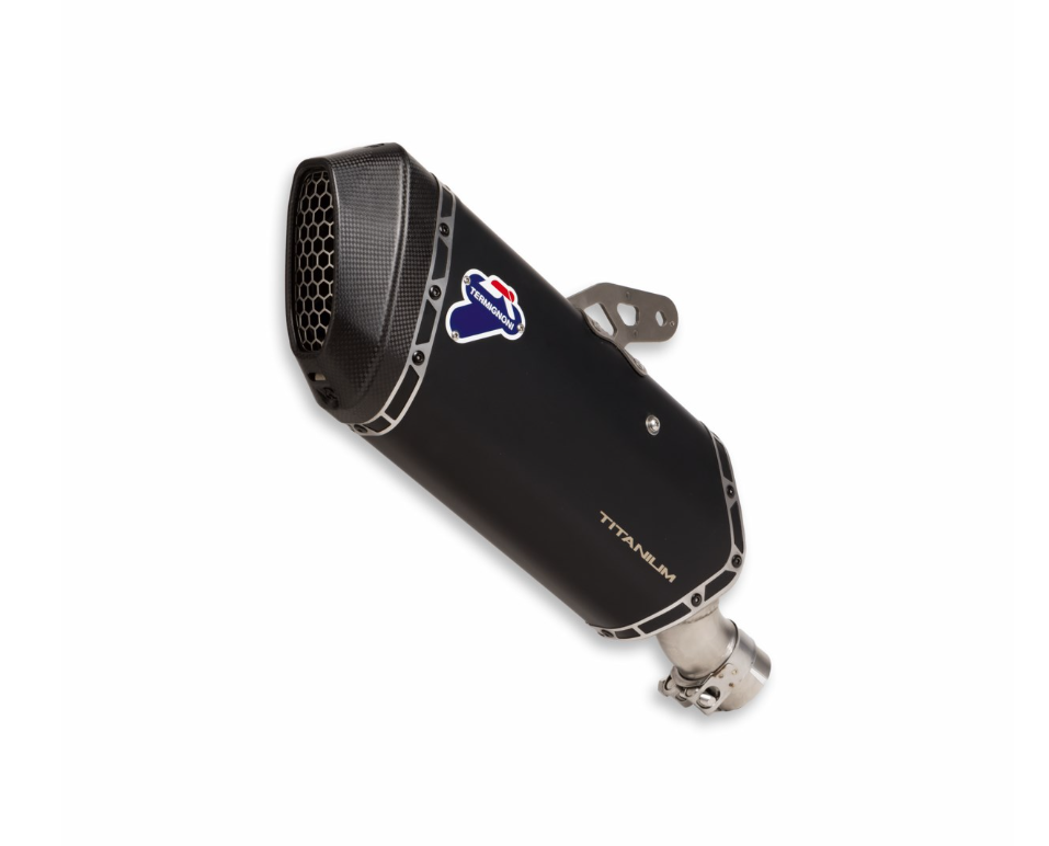 Un accesorio que encarna toda la experiencia y calidad de Termignoni, elaborado con una funda de titanio negro y una base de fibra de carbono.