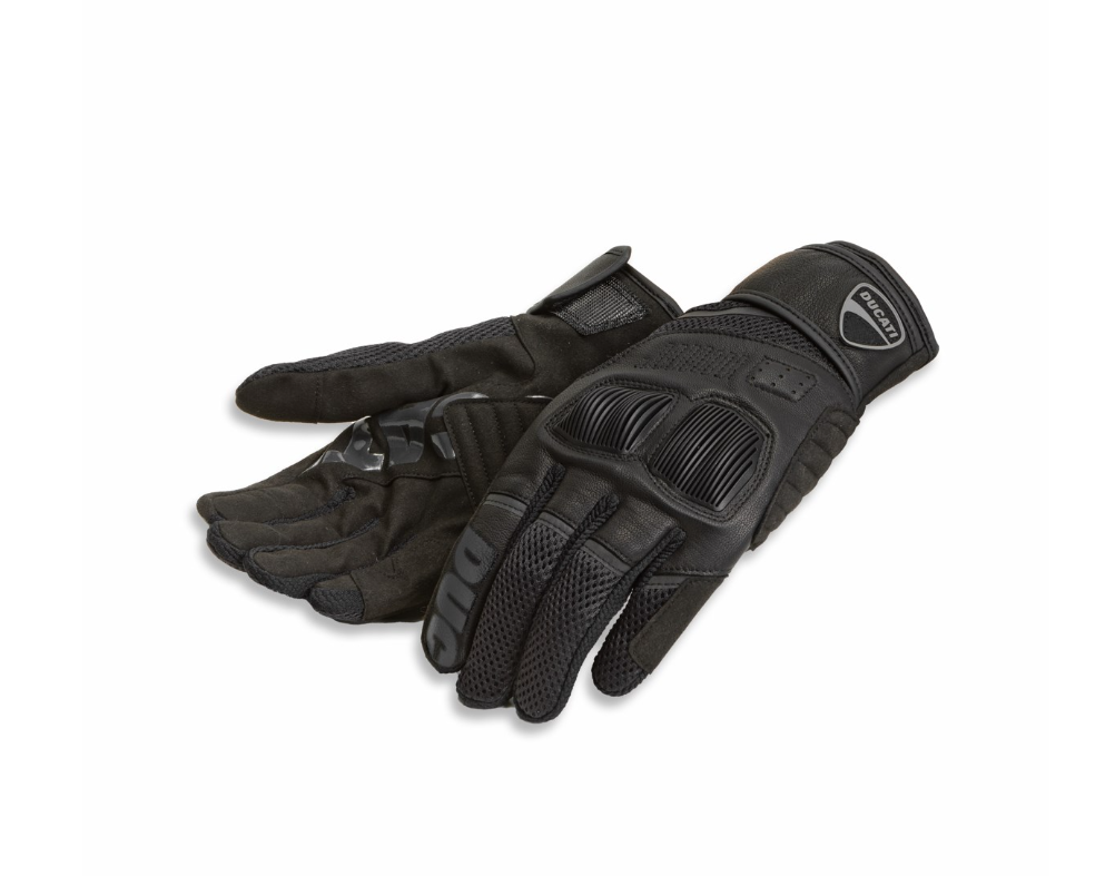 Certificados según los estándares más recientes, ergonómicos, 100% ventilados y confeccionados con una mezcla de piel de cabra y huevo, microfibra y malla 3D, ofrecen ventilación directa gracias al tejido de malla y un ajuste excelente, mejorado aún más por los protectores de nudillos de poliuretano. Diseñados para ser ligeros, incorporan protectores de nudillos para garantizar una alta seguridad. El material compatible con pantallas táctiles en la punta del dedo índice los hace extremadamente prácticos para el uso diario. El cierre de correa de piel con el logotipo añade un toque de estilo a este accesorio, disponible en dos colores, que destaca por su diseño minimalista e inconfundiblemente Ducati.