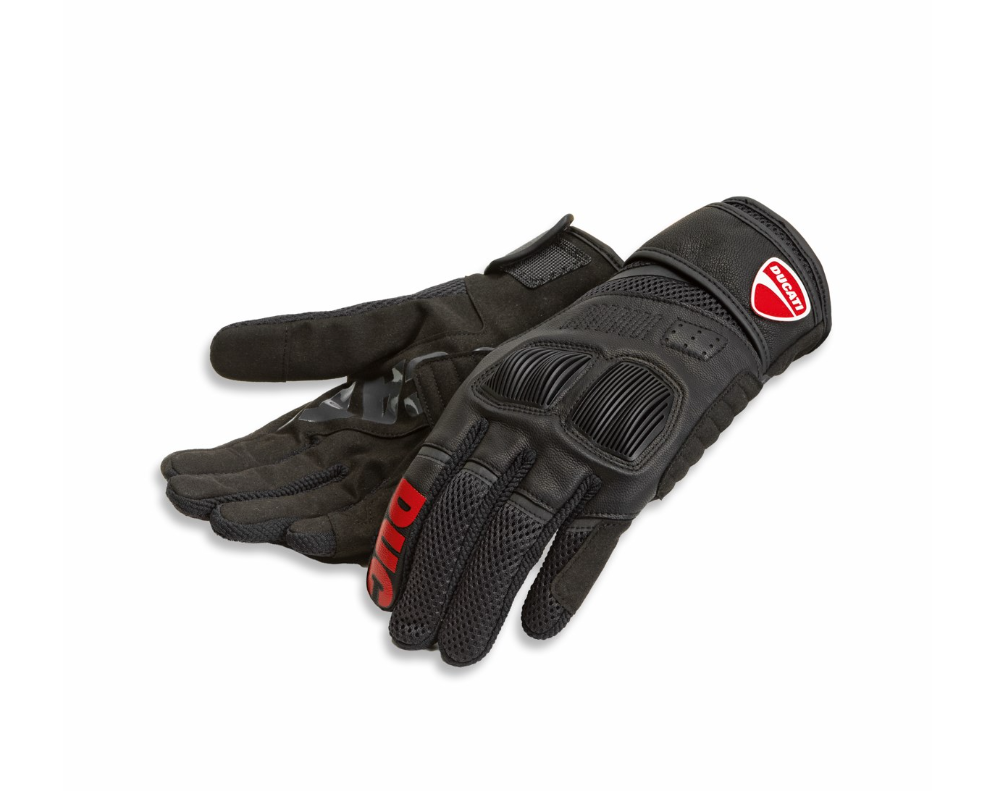 Certificados según los estándares más recientes, ergonómicos, 100% ventilados y confeccionados con una mezcla de piel de cabra y huevo, microfibra y malla 3D, ofrecen ventilación directa gracias al tejido de malla y un ajuste excelente, mejorado aún más por los protectores de nudillos de poliuretano. Diseñados para ser ligeros, incorporan protectores de nudillos para garantizar una alta seguridad. El material compatible con pantallas táctiles en la punta del dedo índice los hace extremadamente prácticos para el uso diario. El cierre de correa de piel con el logotipo añade un toque de estilo a este accesorio, disponible en dos colores, que destaca por su diseño minimalista e inconfundiblemente Ducati.