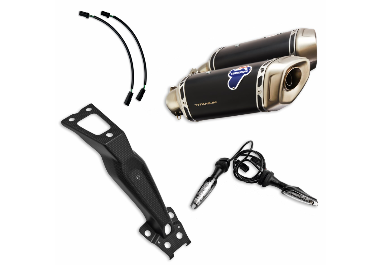 El kit contiene: silenciadores, un soporte de matrícula de fibra de carbono, un par de intermitentes LED dinámicos y un par de extensiones para los intermitentes traseros.