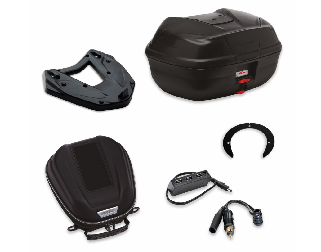 Máximo placer de conducción y practicidad tanto para los desplazamientos urbanos cotidianos como para los viajes de media distancia: este kit de accesorios combina el top case ultra espacioso y su placa de montaje, la práctica bolsa de depósito de bolsillo con sistema de liberación rápida Tanklock® para objetos personales y el útil cable alargador con puerto USB para recargar dispositivos electrónicos.