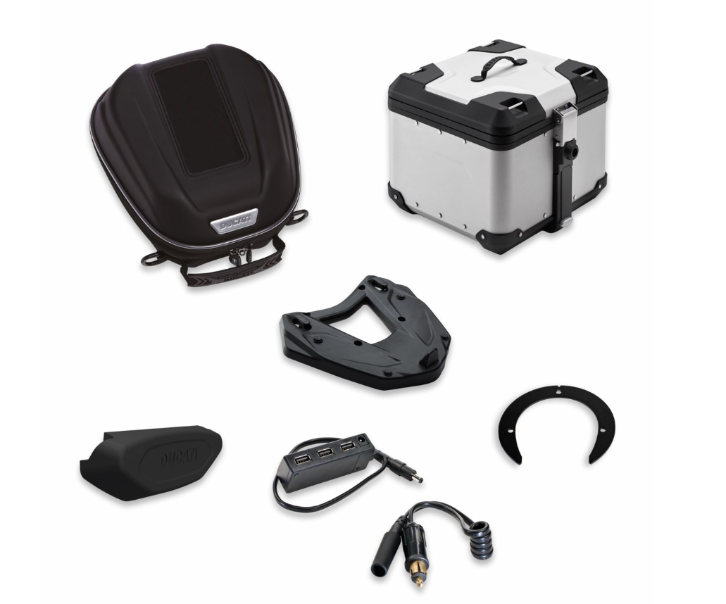 Máximo placer de conducción y practicidad tanto para los desplazamientos urbanos cotidianos como para los viajes de media distancia: este kit de accesorios combina el top case de aluminio ultra espacioso, la funcional bolsa de depósito de bolsillo, equipada con sistema de enganche rápido Tanklock® para objetos personales, y el práctico cable alargador con puerto USB para recargar dispositivos electrónicos.