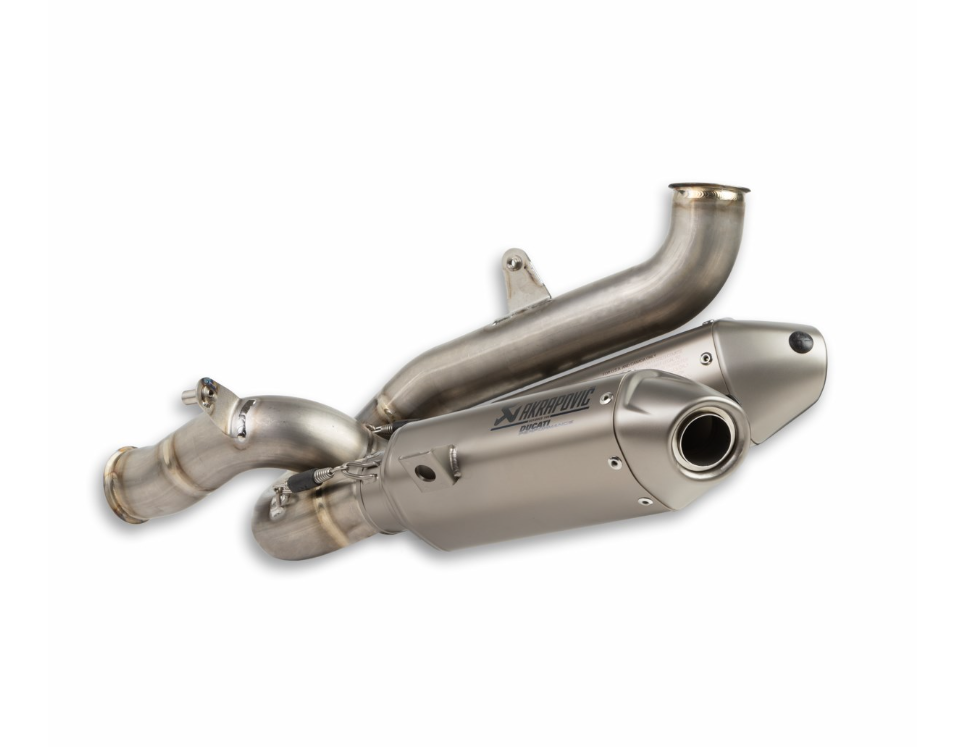 El diseño original de Ducati se fusiona con el cuidado de fabricación de Akrapovič en estos silenciadores de competición slip-on, logrando excelentes resultados.