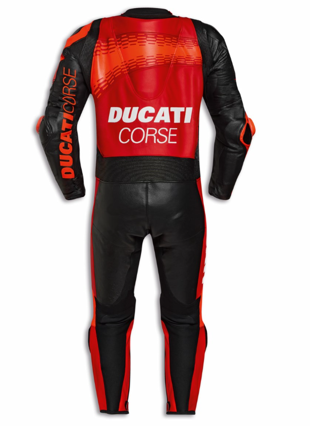 El mono Ducati Corse C7, fabricado por Dainese para Ducati y con un diseño de competición de Aldo Drudi, ofrece el máximo rendimiento y la mayor seguridad.
