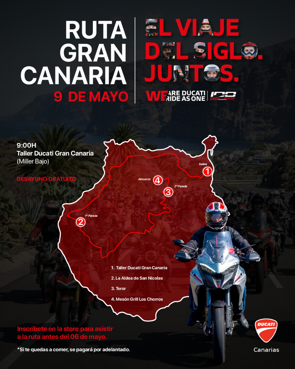¡Vive la esencia de Ducati en Gran Canaria! Te invitamos a disfrutar de una ruta única para auténticos ducatistas, donde la pasión y el espíritu de comunidad y la celebración del centenario de Ducati serán los protagonistas.