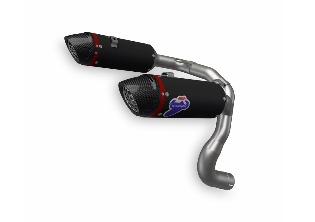 Realza la estética y el carácter deportivo de la motocicleta. Las líneas de los silenciadores se integran armoniosamente con las del vehículo, destacando el diseño imponente de esta motocicleta superdeportiva.