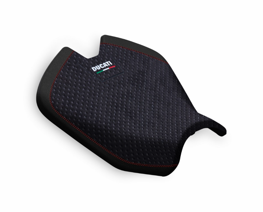 La sección central está hecha de Alcantara perforada para mayor comodidad, mientras que los laterales presentan un material con textura que mejora el agarre del piloto. Esto genera mayor fricción entre el traje del piloto y el asiento, manteniéndolo firmemente sujeto a la motocicleta y permitiéndole mantener su posición sin esfuerzo, incluso al inclinarse hacia adelante.