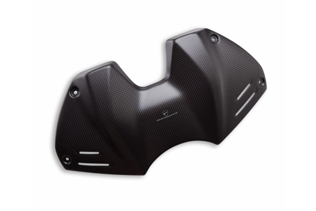 Un hermoso detalle que realza la parte frontal del tanque de la Panigale como sólo la fibra de carbono puede hacerlo. El acabado y las líneas de este accesorio combinan a la perfección con el look racing de la moto deportiva definitiva.